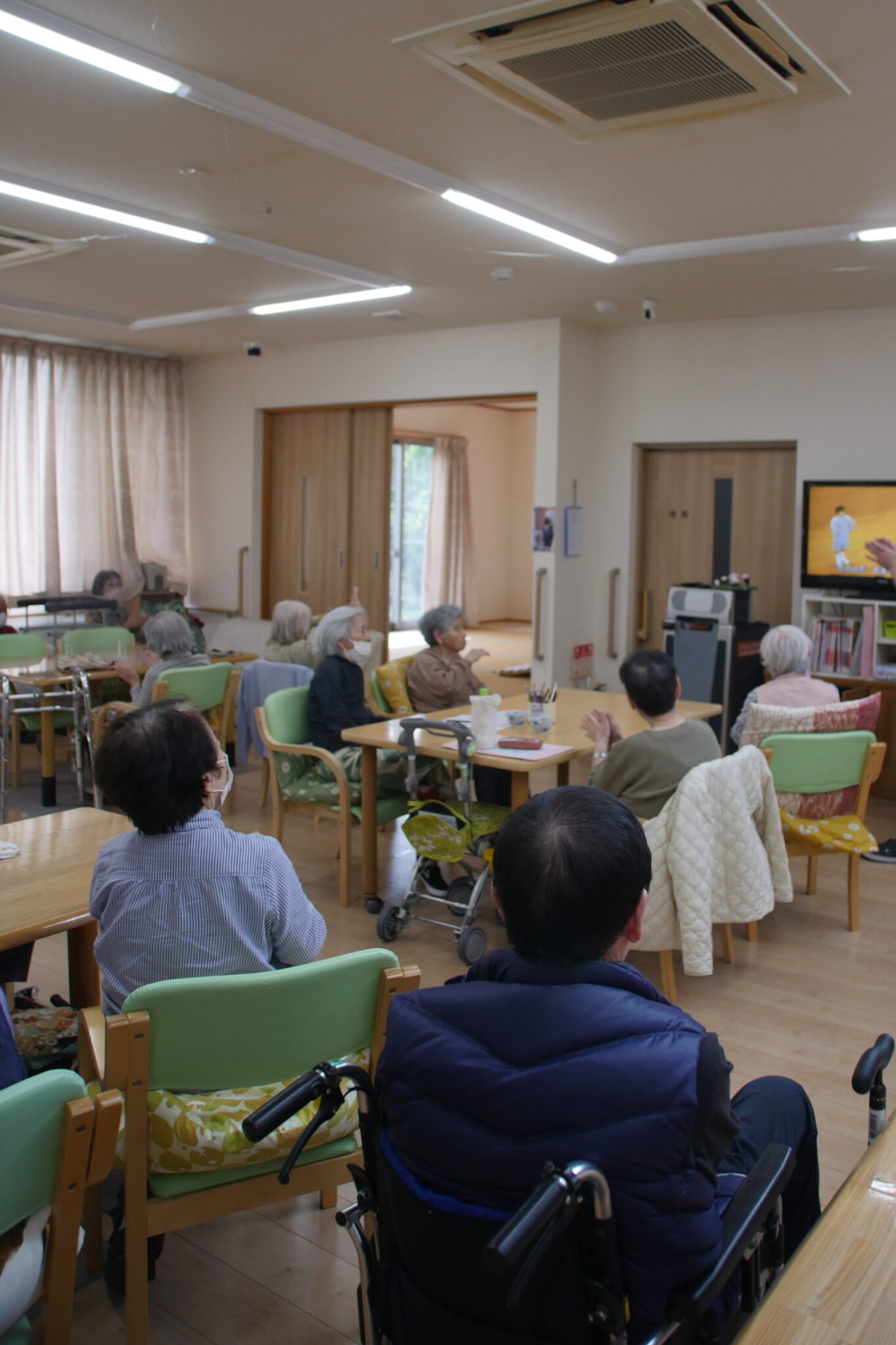 お食事やおしゃべりを楽しむくつろぎのスペース。 手すりが多く設置されており、利用者さんが自分の力で出来るだけ歩けるように配慮しています。 テレビやカラオケもあり、奥には和室もあります。